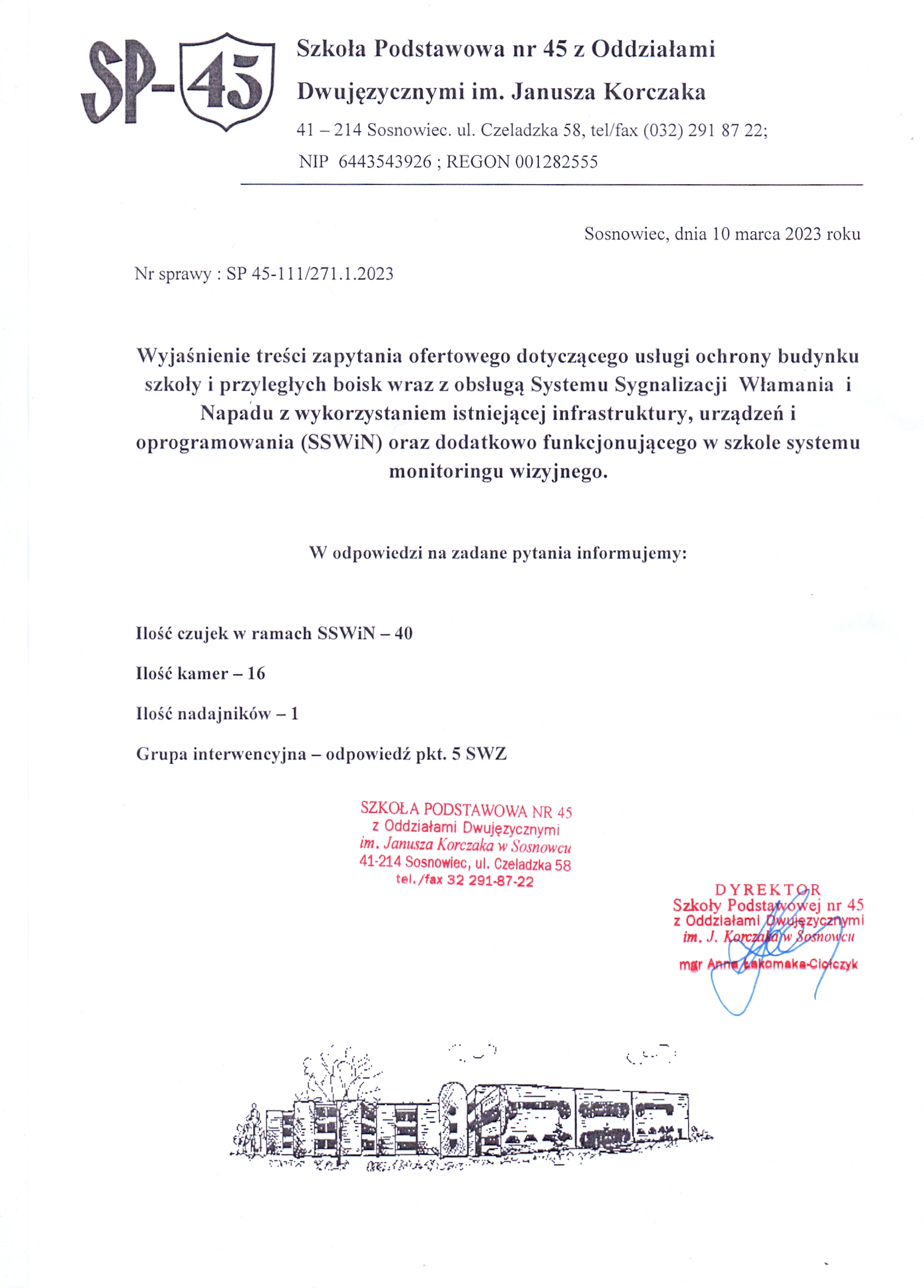 Na podstawie art.2,ust.1, pkt. 1 Ustawy z 11 września 2019r. Prawo Zamówień Publicznych (Dz. U. z 2019r., poz. 2019 ze zm.). Dyrektor Szkoły Podstawowej nr 45 w Sosnowcu, zwraca się z prośbą o złożenie oferty cenowej na usługę ochrony budynku szkoły i przyległych boisk wraz z obsługą Systemu Sygnalizacji Włamania i Napadu z wykorzystaniem istniejącej infrastruktury, urządzeń i oprogramowania (SSWiN) oraz dodatkowo funkcjonującego w szkole systemu monitoringu wizyjnego.